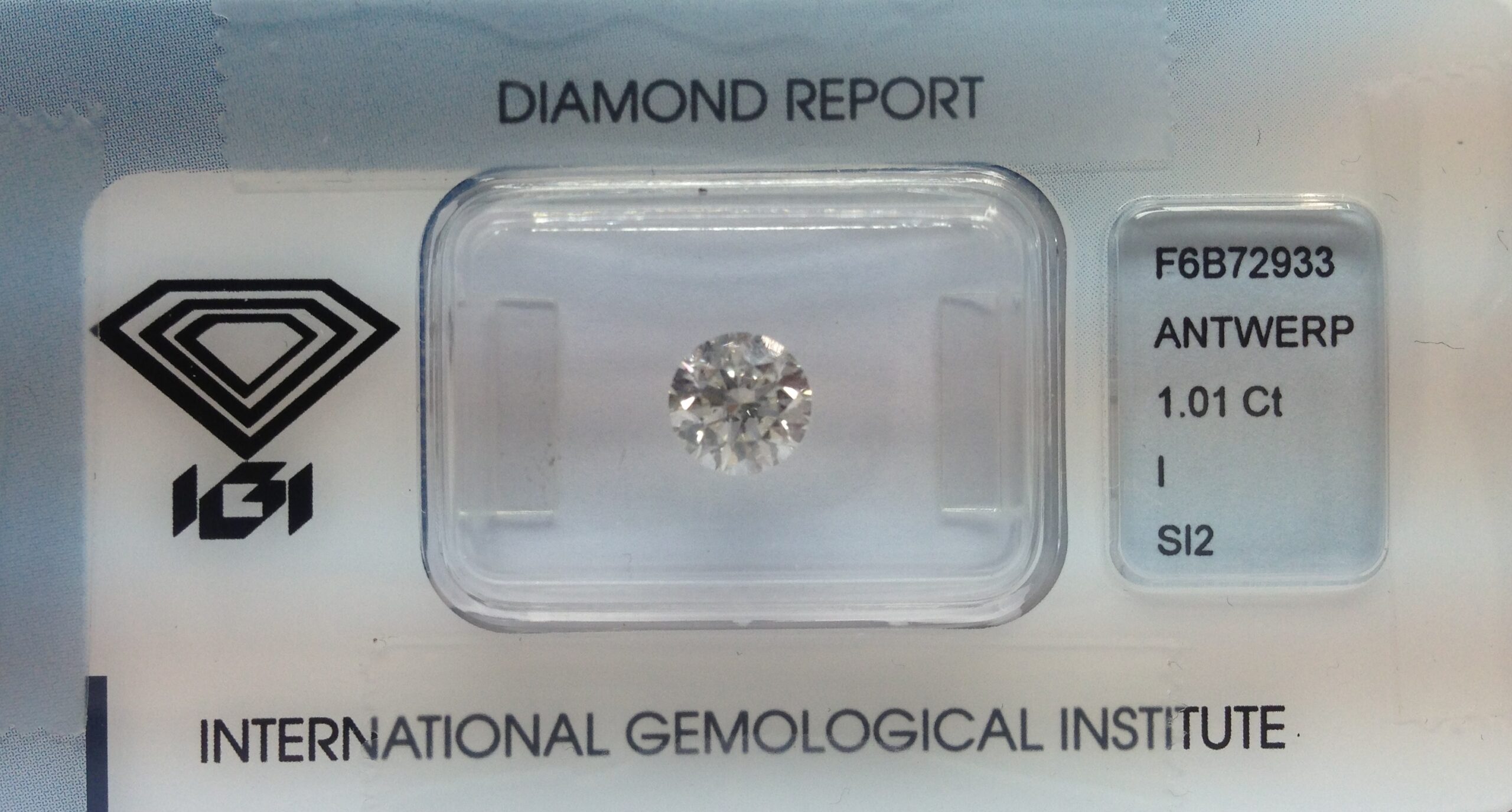 This 1.01 ct natural diamond has been graded by IGI as I color and SI2 clarity, with a Very Good cut.