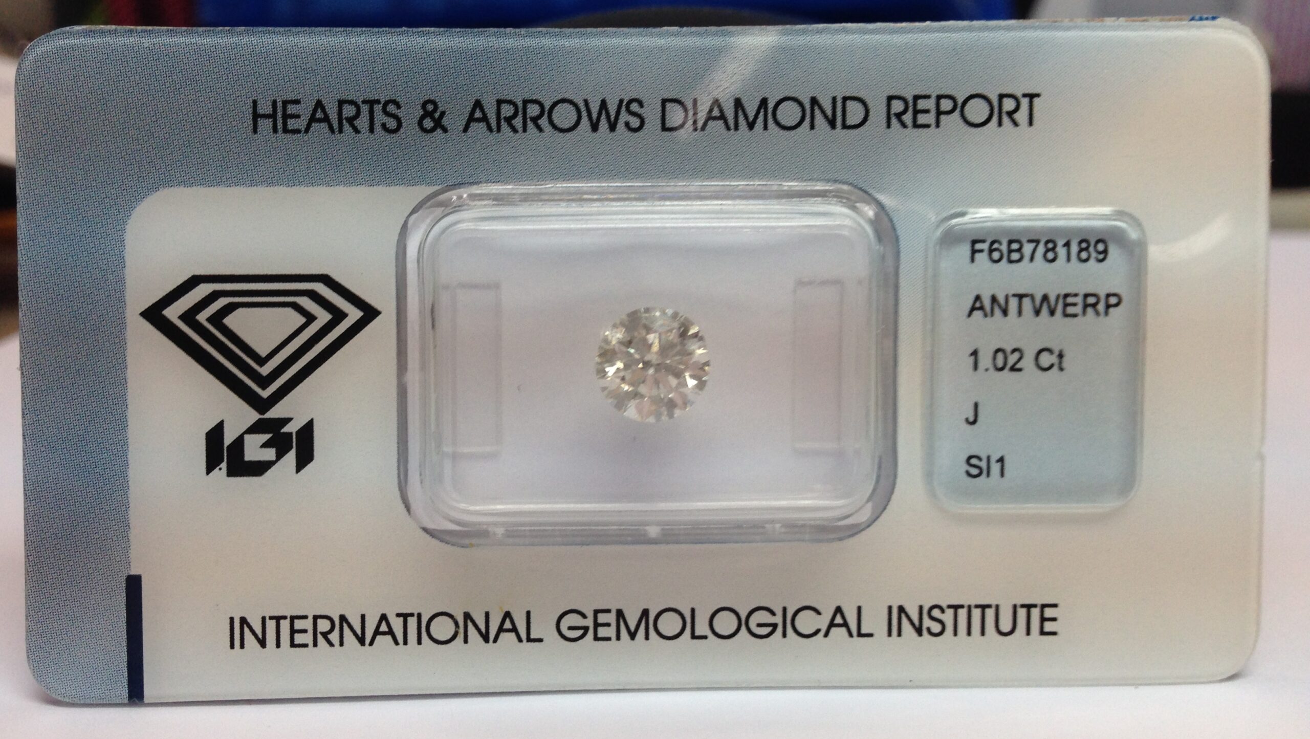 This 1.02 ct natural diamond has been graded by IGI as J color and SI1 clarity, with an Excellent cut.